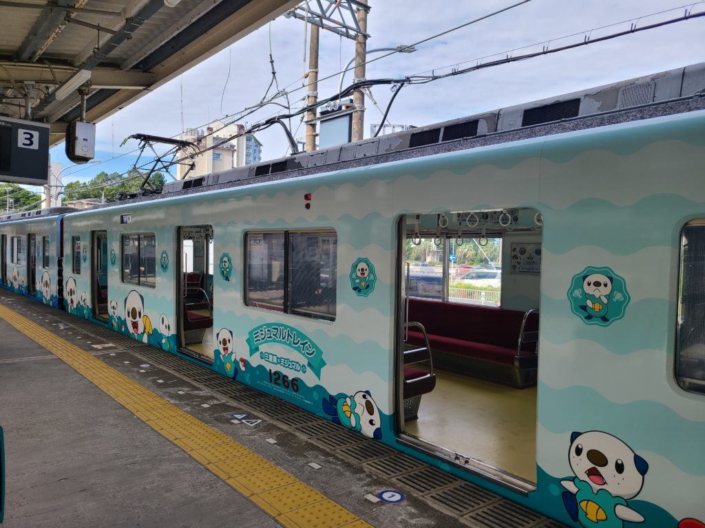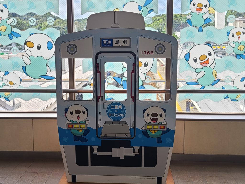 続いて伊勢市駅から鳥羽駅へ。なんとミジュマルトレインそのものに乗ることができた。外装も内装もみ~んなミジュマルだらけ。5駅程度なので近かった。ちなみに鳥羽駅構内もミジュマルがいっぱいである。停車駅名の看板にもミジュマル。