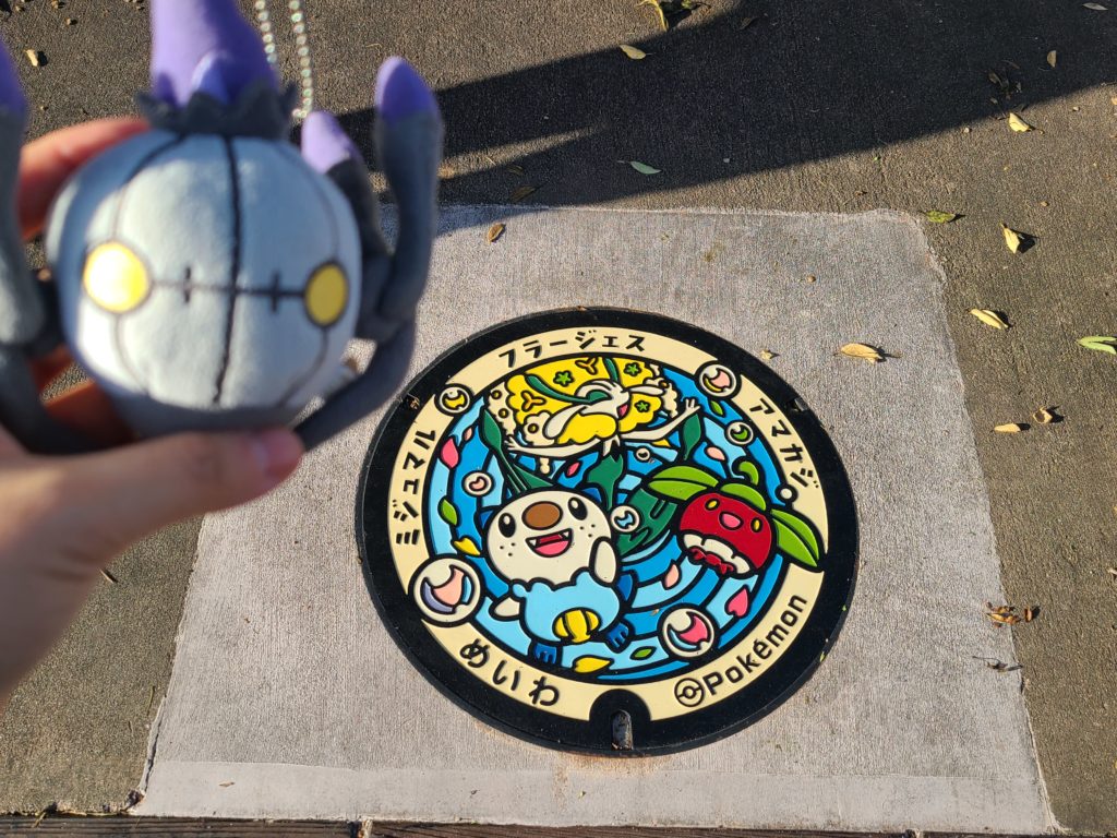 ミジュマル・フラージェス・アマカジのポケふたである。フラージェスは数百年ある長い寿命を、自分のテリトリーである1つの花園・庭園(お城の庭園であることもあるらしい)を守るために生きているというポケモン図鑑の説明がある。斎宮跡には季節になると花が咲き誇る菜の花畑もある模様なので、黄色いフラージェスとマッチしているのだろう。一方でアマカジはフルーツをイメージした果実のポケモンだが、ここの有名フルーツは何だろう…?後から調べると柿や苺などが採れるそうだが、明確な特産品という位置づけであるかどうかは不明なところ。寧ろフルーツに拘らず、アマカジの頭のへたが花菖蒲の形状に似ているのでは…と思った方がしっくり来るような気がした。ちなみに通常色のアマカジを見ると分かりづらいが、色違いのアマカジは頭のへたが紫色だ。