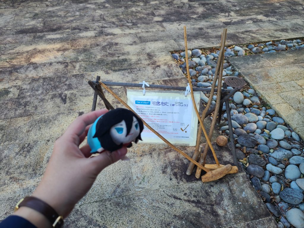 時間に追われている立場とはいえ何もやってこないのは勿体ない気がして、館外の広場に置かれている「毬杖(ぎっちょう)」を使って家族と遊んでみた。(自分らが遊ぶ前に、先に体験をされていた家族連れの方から「やりますか」と気さくに声をかけられて、キョドって「まずは見させていただきます」という感じでもにょもにょと返答したことを思い出す。本当に見学させて頂いた後にトライする形になった)